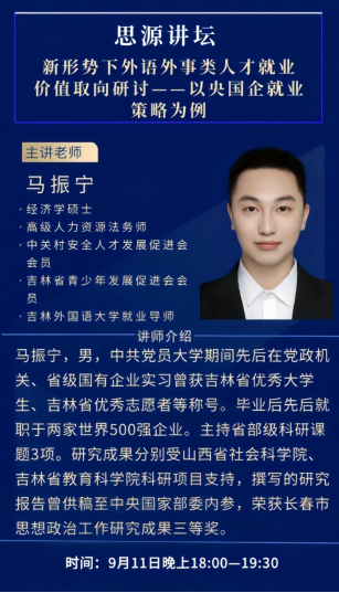 为助力外语外事类学子明晰就业方向,把握央国企就业机遇,英语学院于2025年9月11日晚18时通过腾讯会议召开了主题为新形势下外语外事类人才就业价值取向研讨———以央国企就业策略为例的演讲。本次会议由学工办主任侯德军老师主持,邀请了我院毕业生马振宁同学作经验分享。