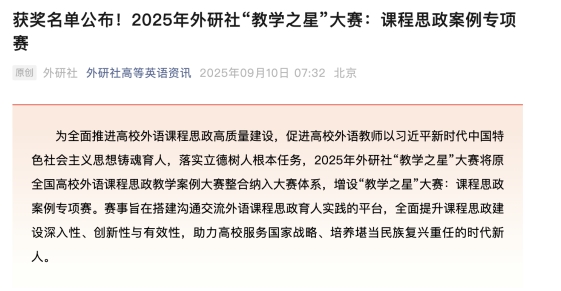 在9月10日揭晓的2025年全国高校外语课程思政教学案例大赛中,英语学院教师凭借卓越的教学实力与深厚的思政底蕴,以65项获奖总数再创历史新高——其中包括特等奖2项、一等奖4项的亮眼成绩。这成绩不仅是对我院外语教学质量与课程思政建设工作的高度认可,更是全体师生同心同向、锐意进取的奋斗结晶,充分彰显了英语学院在课程思政育人实践中的硬核实力与创新活力。