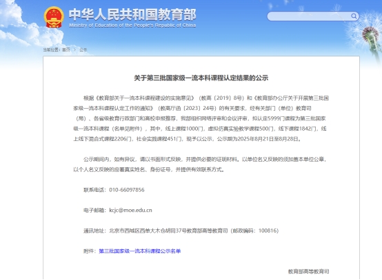 近日,教育部公示了《第三批国家级一流本科课程认定结果》,英语学院2门线下课程成功入选,占我校此次获批总数的40%,成为学院课程建设与专业发展的又一重大标志性成果。