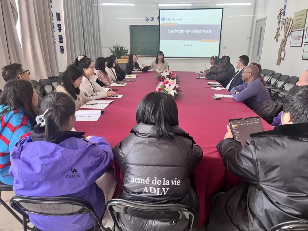 为明确新学期教学管理要求,搭建学院与外籍教师的沟通桥梁,确保各项教学工作有序开展,近日,英语学院期初外籍教师工作会议成功召开。全体外籍教师参会,会议由学院负责国际交流的助理田慧老师主持,负责教学管理的助理邹红老师、各系部负责国际交流的副系主任,以及辅助外教工作的中教和学生助教列席会议。