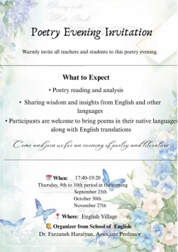 首场诗歌之夜于 9 月 25 日开启,后续 10 月 30 日、11 月 27 日也将如期举办。此次活动由英语学院的 Farzaneh Haratyan 副教授组织,旨在为师生营造浓厚的文学氛围,让大家在诗歌的世界里尽情遨游,感受多元文化的独特魅力。热爱诗歌的你,千万不要错过这场每月一次的文学盛宴!